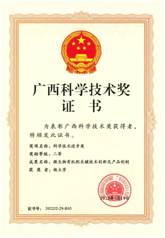 一、“微生物有机肥关键技术创新及产品创制”获广西科学技术进步奖二等奖