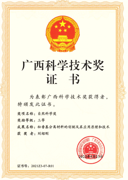 一、“松香基分离材料的创制及其应用原理和技术 ”获广西自然科学技术奖三等奖。